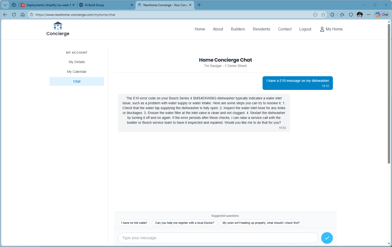 The platform features a user-friendly dashboard with account management, calendar integration, and an AI-powered chat interface. Residents can access their home details, schedule appointments, and get instant support for appliance issues, local services, and community information.